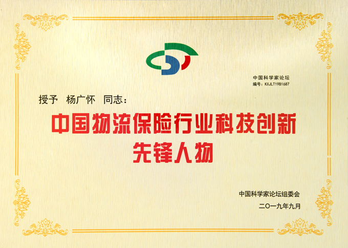 中国物流保险行业科技创新先锋人物-证书